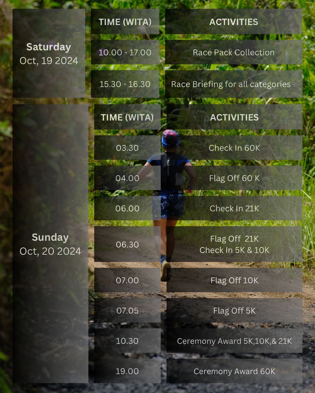 Ia juga mengungkapkan acara tahun ini menawarkan beberapa kategori, termasuk kategori 60 kilometer. Pelari yang berpartisipasi dalam kategori 60 kilometer diberi waktu maksimal 14 jam untuk pria dan 15 jam untuk wanita, sementara kategori 21 kilometer memiliki waktu tempuh maksimal 6 jam. Tak tanggung-tanggung, total hadiah yang diperebutkan mencapai Rp178 juta.